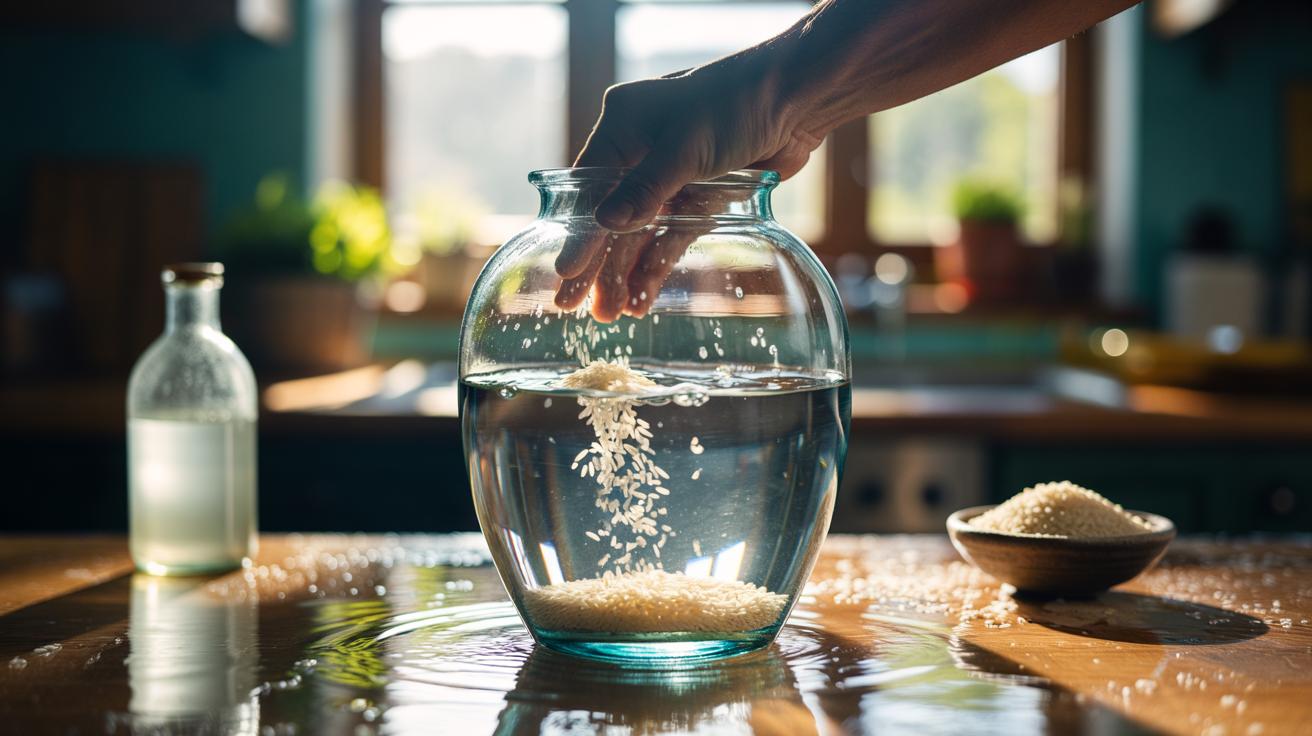 Pour out the contents through a sieve to catch the grains. Rinse thoroughly with cool water until it runs clear and squeak-free. Air dry upside down on a lint-free cloth. Finished glass should sparkle, without streaks or sticky patches. If a faint ring persists, repeat briefly with fresh rice and a touch more vinegar. Results tend to improve dramatically on the second pass.